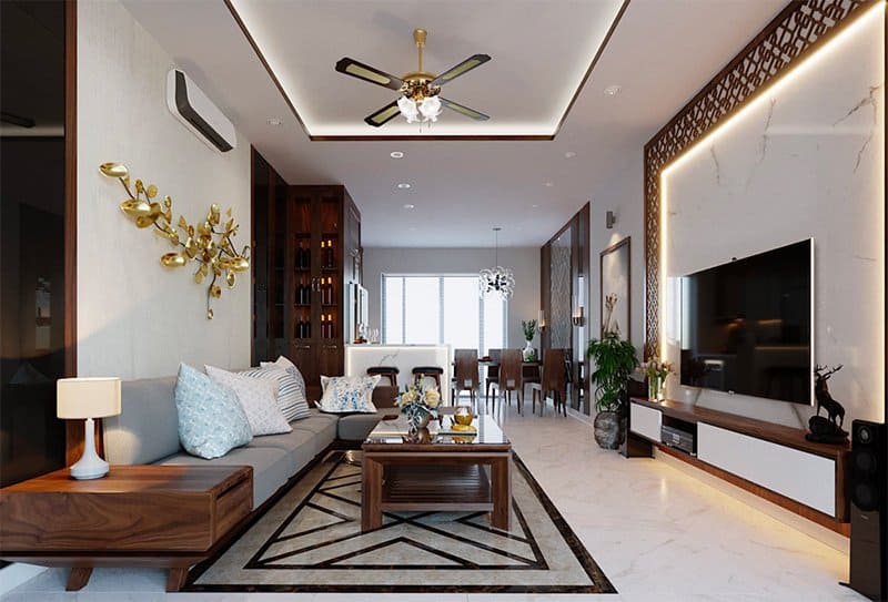 Đây là thiết kế dành cho những gia chủ thích sử dụng những bộ trường kỷ, bàn ghế gỗ truyền thống phương Đông thay vì các bộ sofa phong cách Âu. Những mẫu thiết kế phòng khách như thế này, cần kết hợp cách “đánh” đèn để không gian tươi sáng, lung linh hơn. Chú ý cách hoạ tiết tường, trang trí khác phải phù hợp với phong cách này.